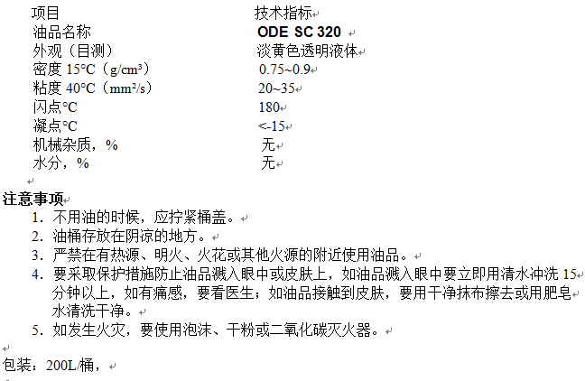 ODE SC320搓絲油,由高度精制的進口基礎油和多種******進口添加劑調配而成,不含氯及重金屬,中等粘度、高閃點,具有很好的粘溫性,抗老化。