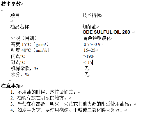 ODE SULFUL OIL 200金屬切削油,由高度精制的基礎油和多種******添加劑調配而成,中等粘度、高閃點,具有很好的粘溫指數,抗老化。
